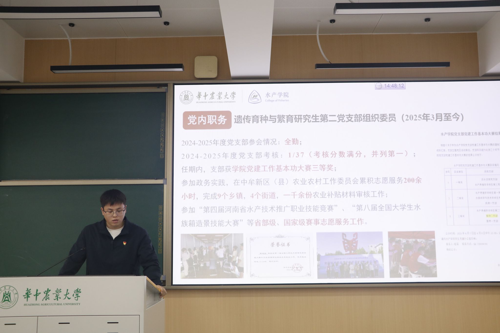 (通讯员:姚营新 瞿昊)10月18日下午,水产学院举行2025年研究生国家奖学金答辩评审会,旨在落实研究生国家奖学金评审政策、发挥优秀学生榜样作用。26名研究生围绕科研成果、实践经历及综合素养汇报答辩,评审委员会由专家老师评委与研究生代表评委组成,最终评选出硕士12名、博士6名。