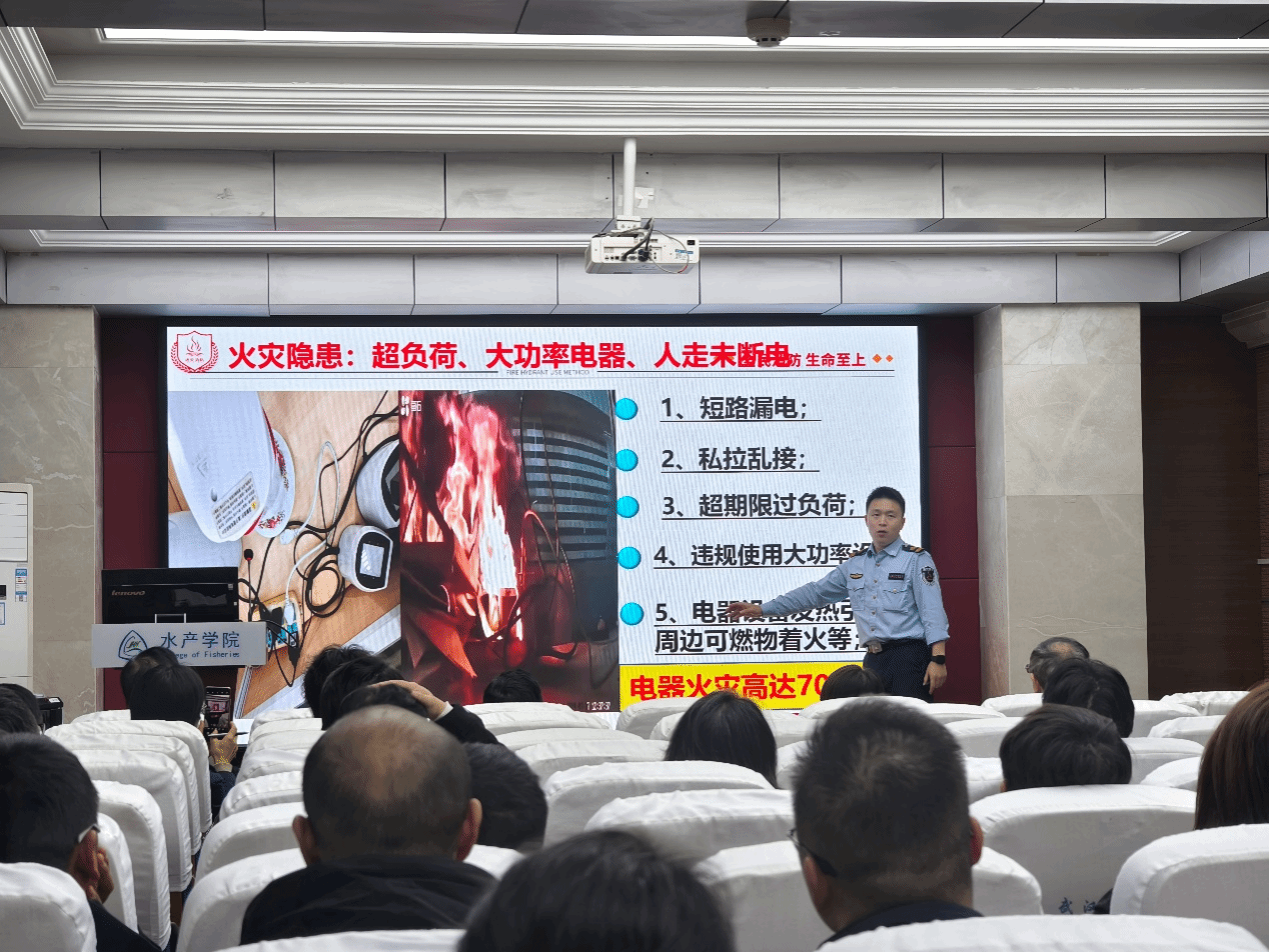 2025年11月13日下午,我院在水产楼A105报告厅开展全院教职工消防安全专题教育,邀请武汉市进安消防中心程龙教官进行消防安全培训。会议由学院副院长沈继斌主持。
