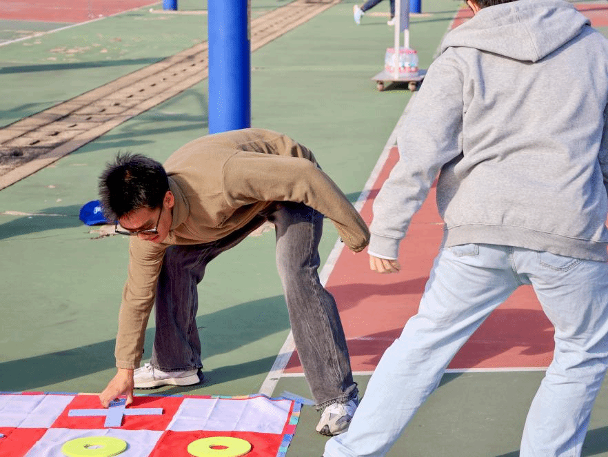 赛场之外,东运动场篮球区的嘉年华活动人声鼎沸。由水产学院策划的“极速三子棋”活动将平板支撑、接力赛与三子棋巧妙融合,既比拼智慧,也挑战体能。师生们排起长龙,笑声与加油声此起彼伏。选手们俯身支撑、挥汗奔跑、精准落子,每一次对弈都充满趣味与激情。动物科学技术学院、动物医学院2403班的杨沁睿同学兴奋地说:“这个游戏真的太有趣了!我们互相鼓劲,玩得特别开心。输赢不重要,重要的是过程。”